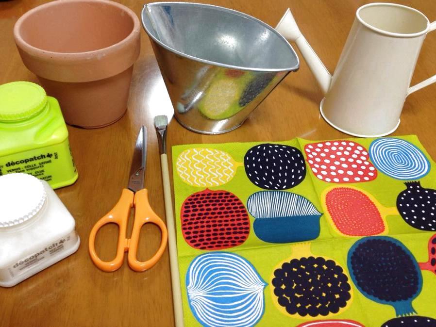 ・デコパージュのり 今回はセリアで売っているものを使用 ・その他の道具はさみ、筆、筆を洗う用のコップ、濡れタオル 筆はなければ、指で塗ってもokです。 筆を使う場合は、デコパージュで使った筆はすぐに水につけて下さいね。 2度目のデコパージュで分かったこと。うまく作るコツ 2度目のデコパージュで失敗してみてわかったことは、 「紙質が大事」 ということ。 紙が硬いと、水を吸わず、液でふやけて シワシワ になってしまうことが分かりました。